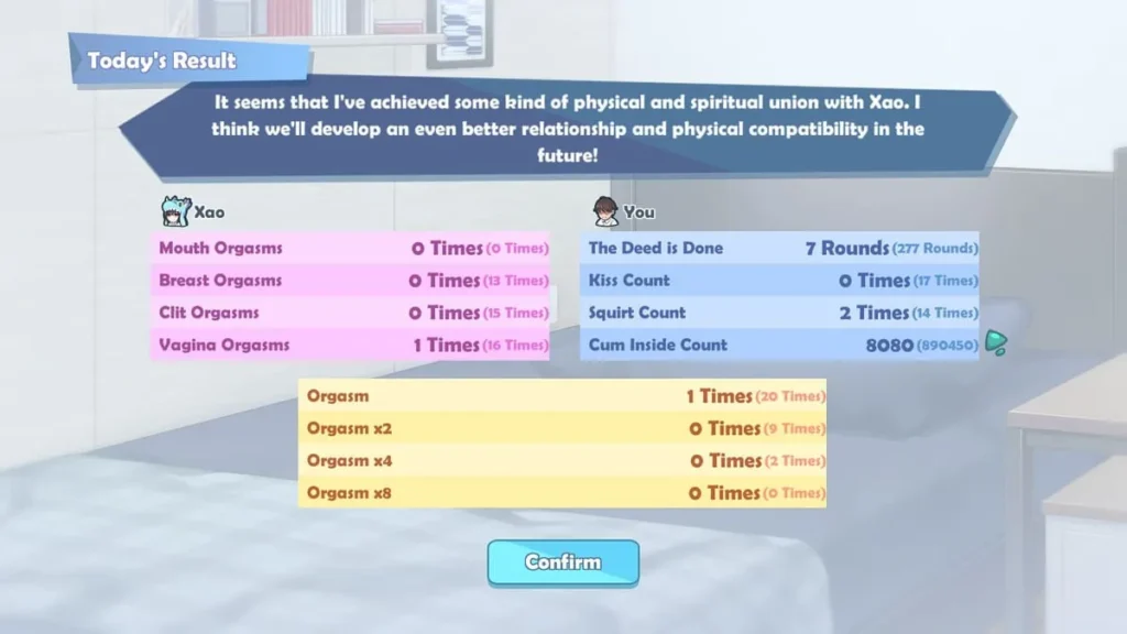 | Flirting / Bonding Conversation | 20% | Increases Relationship Meter, unlocks special scenes & abilities |