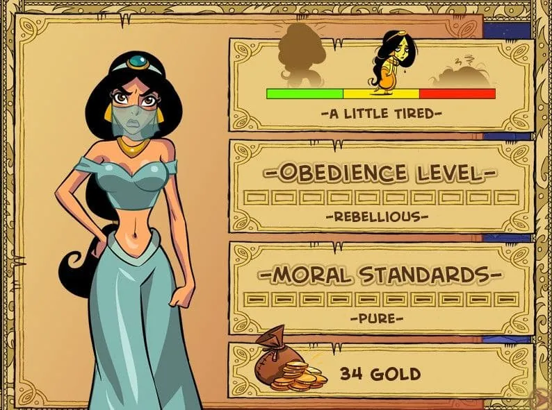 But gold is just the beginning. The true game progression system is gated by character stats, primarily Fitness. Jasmine’s physical condition is a hard stat that you must improve through dedicated training at the palace grounds. Certain quests are literally impossible if her fitness is too low. You’ll track this on a scale, and watching it increase is a clear, satisfying measure of your progress.